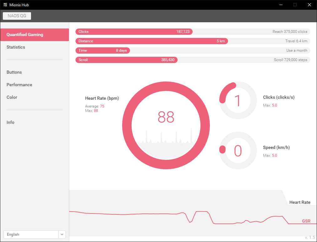Il programma risulta molto semplice ed intuitivo da utilizzare, appena avviato si ha una panoramica dello storico del mouse (numero di click, metri percorsi, scroll e giorni di attivitá), il nostro BPM e lo stato di stress.